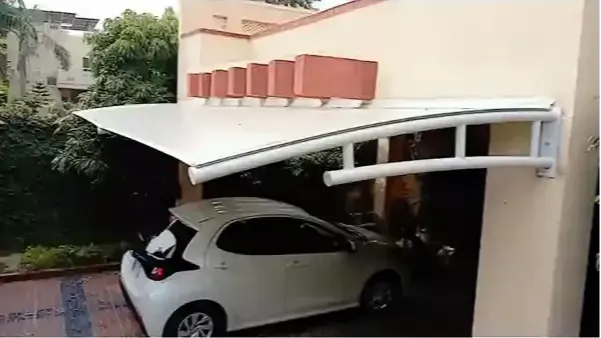 Our car parking shades are built using a robust MS (mild steel) structure with high-quality PVC-coated tensile membrane fabric. The standard size—20 ft (width) × 18.20 ft (projection) from pole to pole comfortably covers two vehicles with doors fully open.